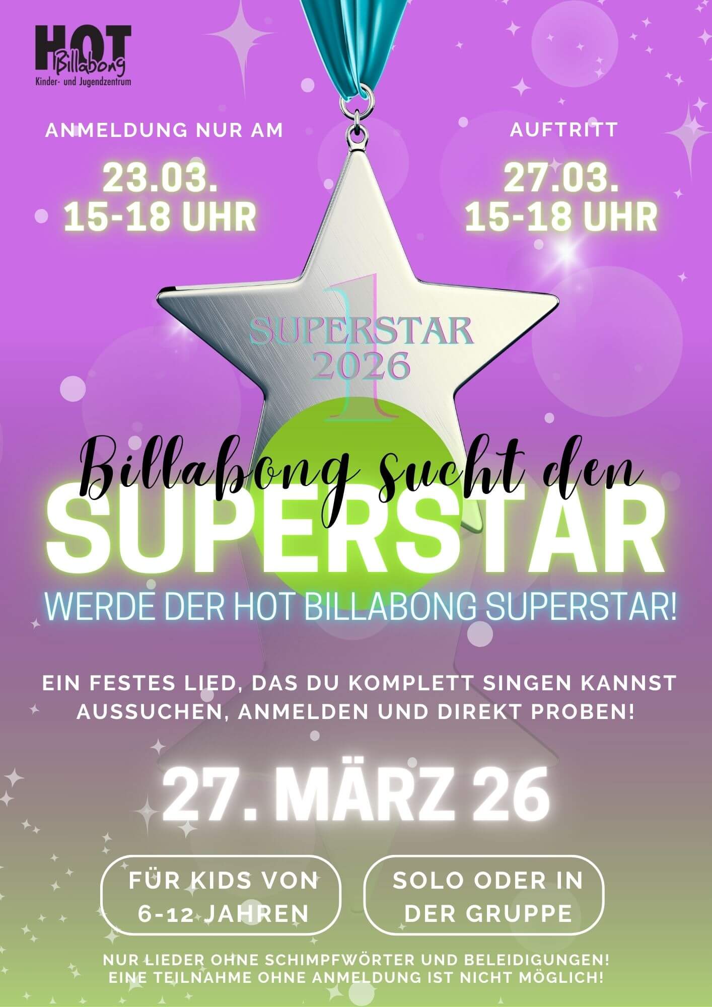 Am Freitag, 27. März, heißt es wieder „Billabong sucht den Superstar“. Unser Gesangswettbewerb startet in eine neue Runde! Du willst dabei sein? Dann komm am Montag, 23. März, zwischen 15 und 18 Uhr ins HOT Billabong, melde dich an und bring dein Auftrittslied direkt mit. Proben? Machen wir gleich vor Ort.
