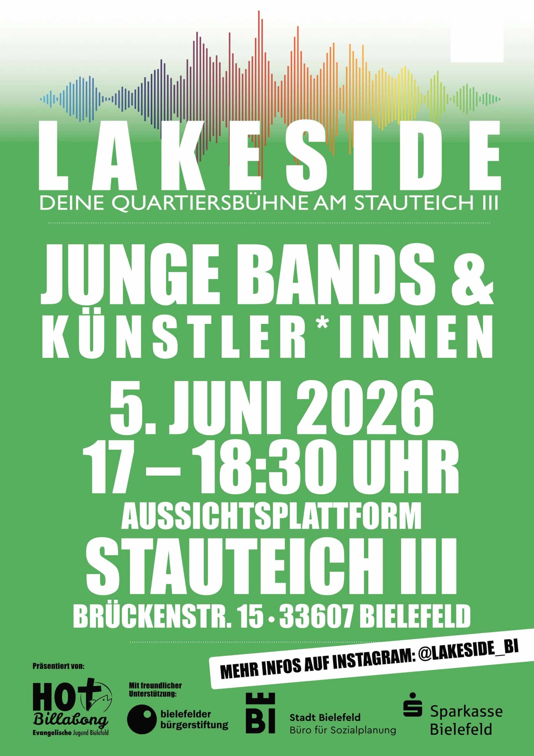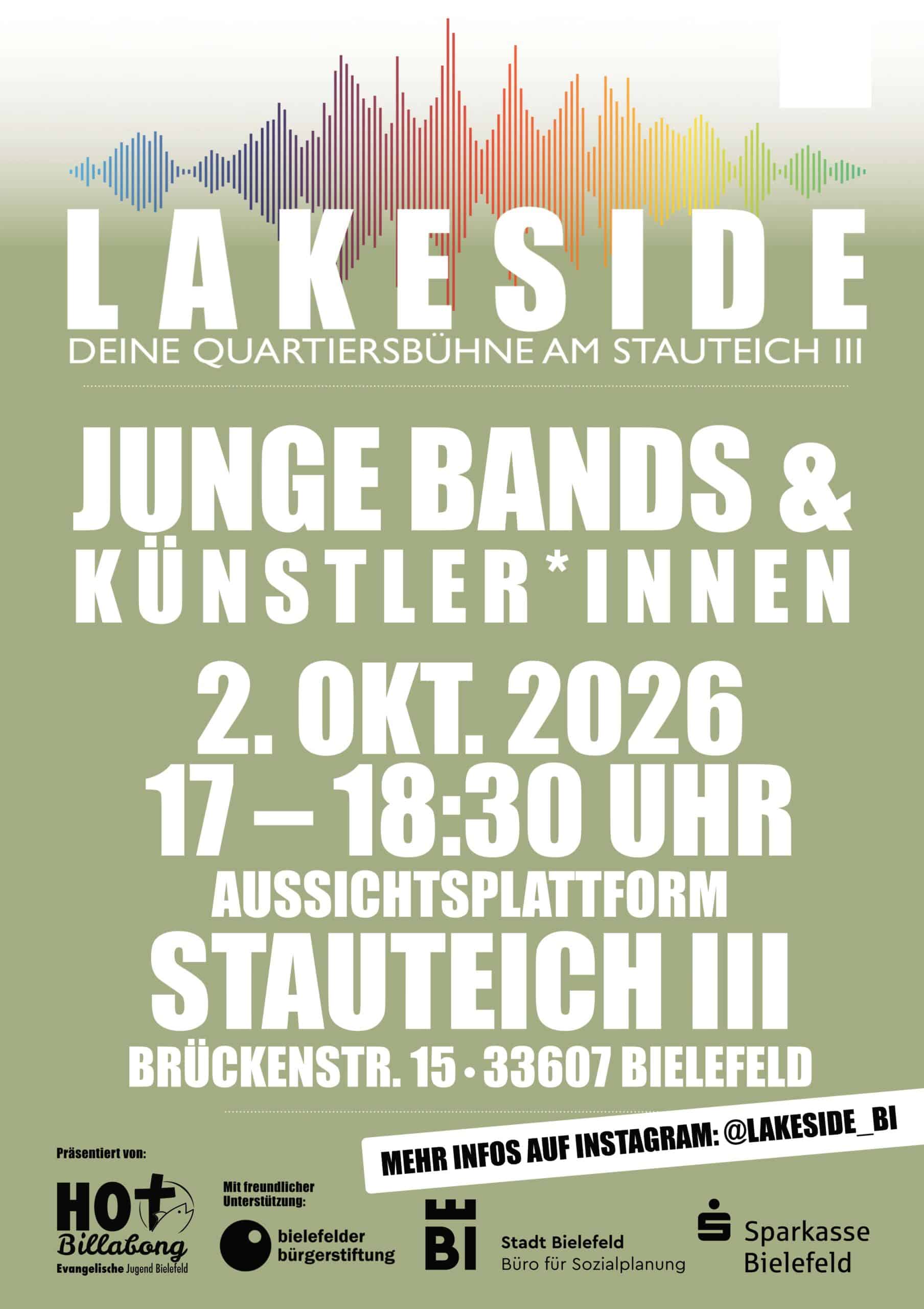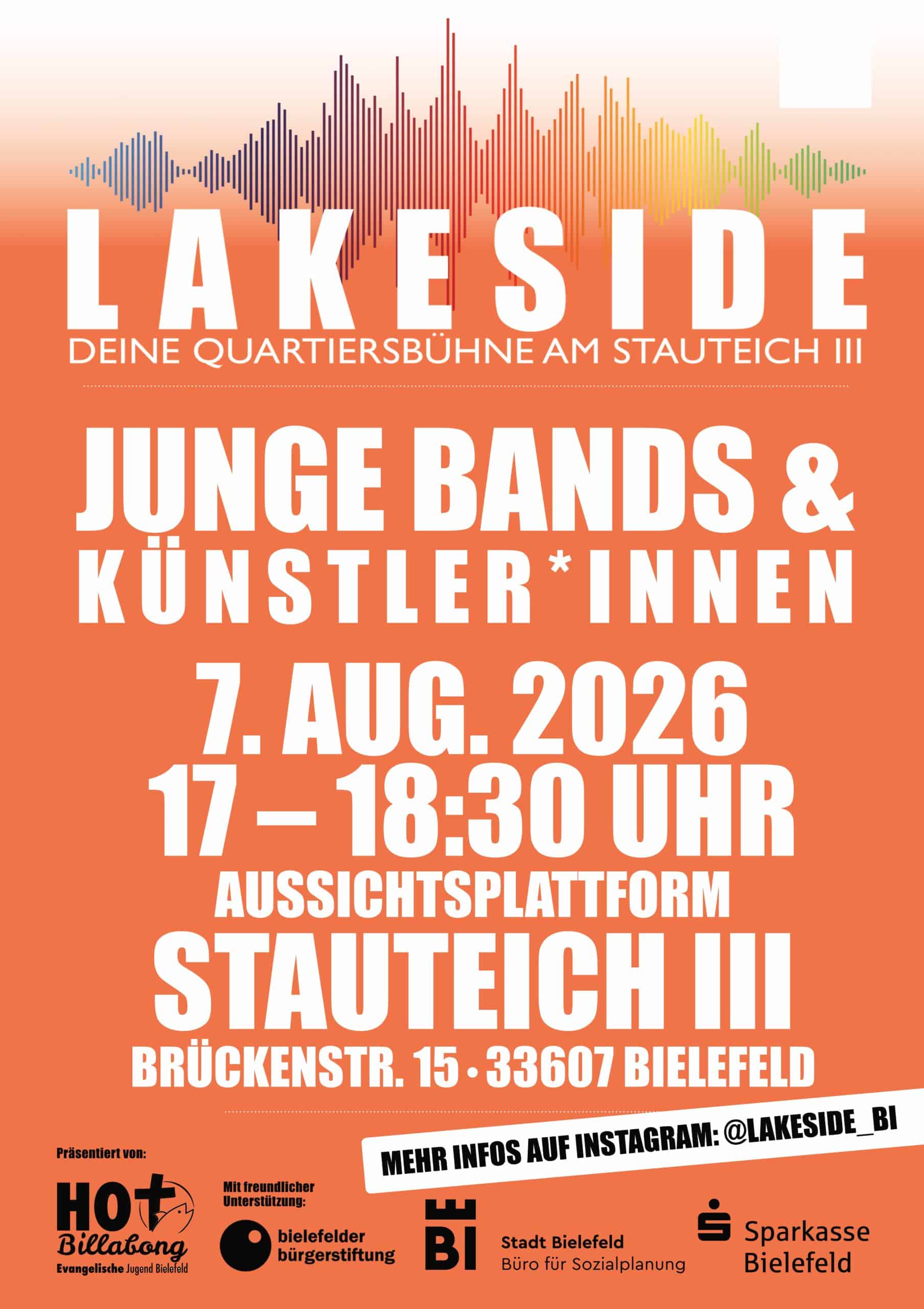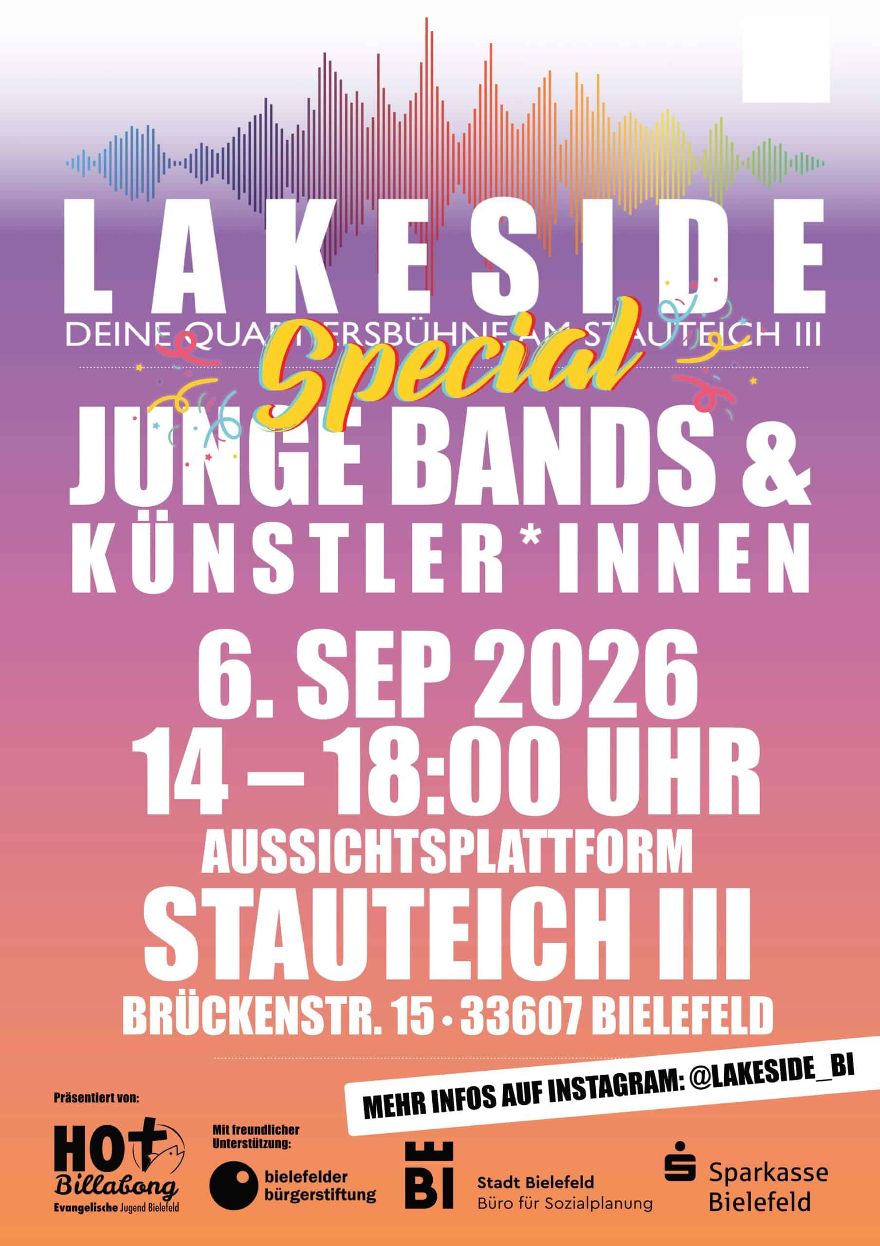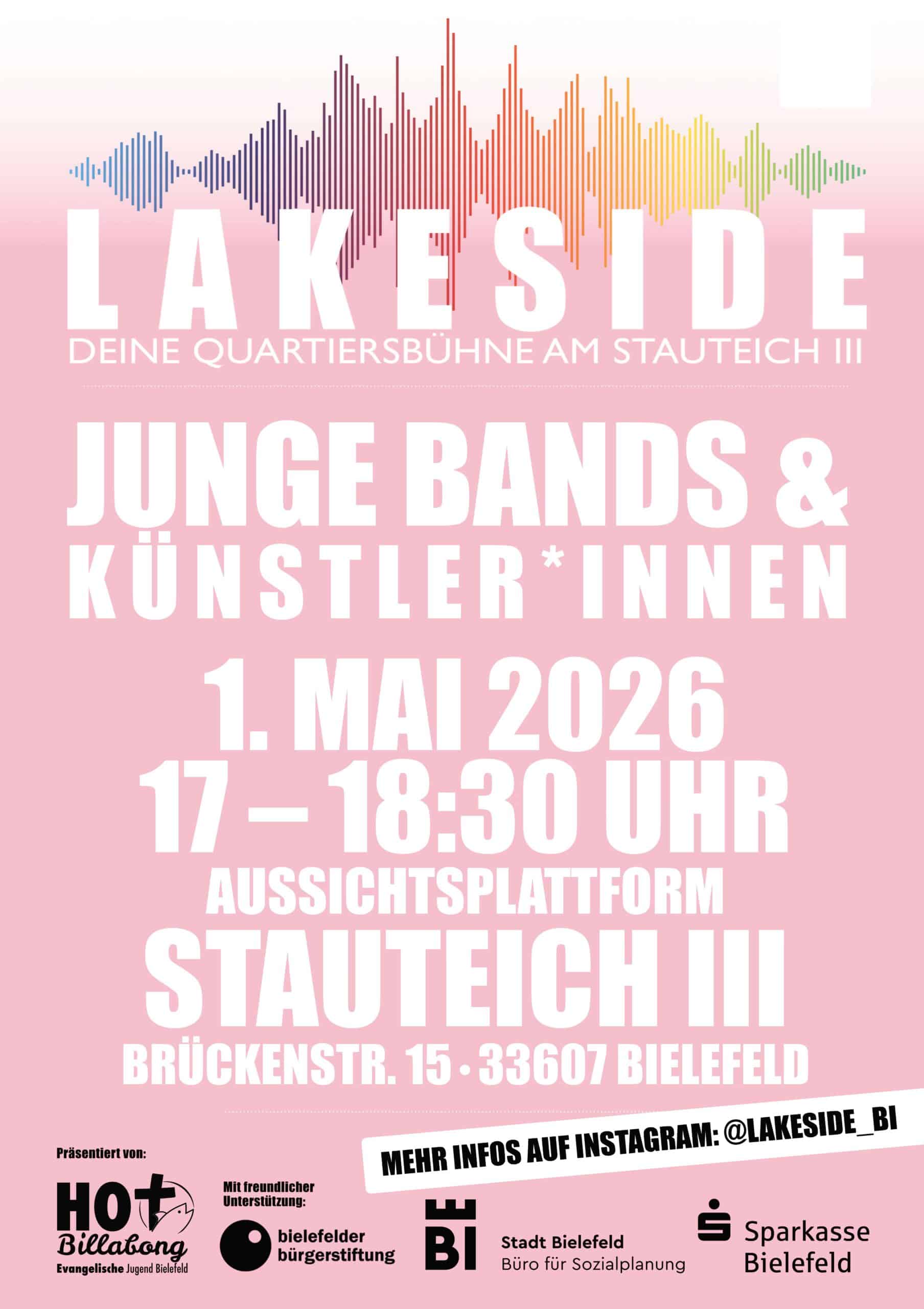Unser Ziel: Spannenden, jungen Bands und aufstrebenden Künstler*innen aus der Gegend eine Bühne bieten. Festivalstimmung für Alle – Umsonst und Draußen! LAKESIDE bedeutet: Bunter Genremix, familiäre Kulisse und sommerlicher Open-Air-Flair garantiert.